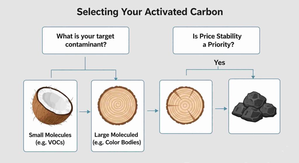 - Step 1: Identify Your Target Contaminant: The most crucial factor is the molecule size you must remove. Are you targeting small, dissolved volatile organic compounds (VOCs), which points toward a microporous coconut shell-based carbon? Or are you removing large, complex color molecules from a syrup, which indicates a macroporous wood-based carbon is the better choice?