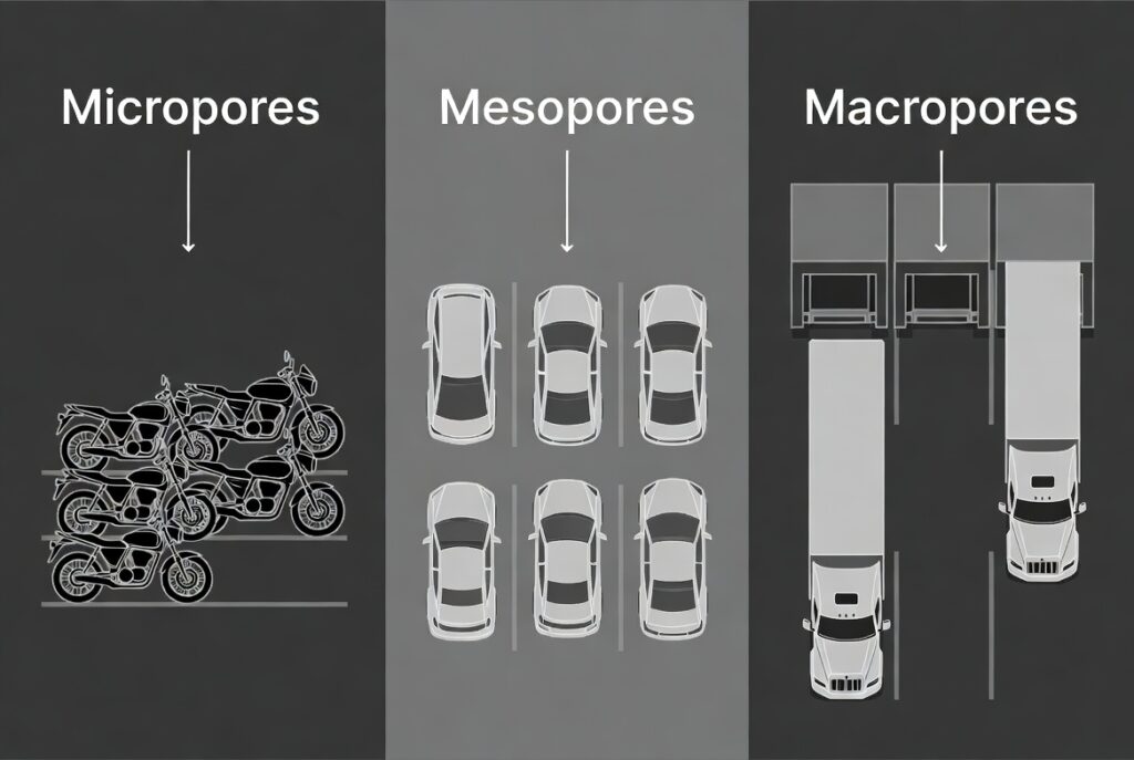 1. Micropores (Small Spots): These are tiny parking spots, perfect for motorcycles or compact cars. In filtration, these trap small molecules like volatile organic compounds (VOCs) and chlorine.