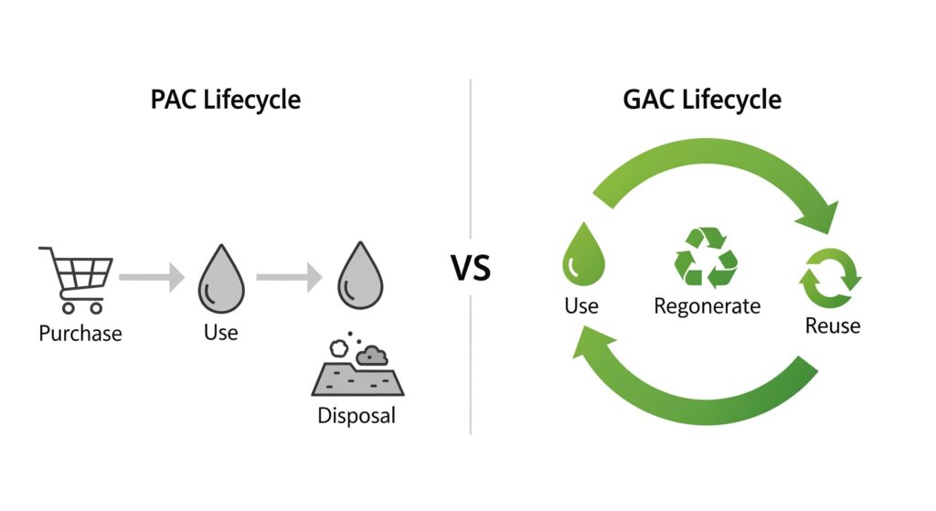 • Regeneration vs. Disposal (OpEx): This is the most critical factor in the long-term economic comparison. GAC can be removed from its vessel and thermally reactivated off-site, restoring its adsorptive capacity for reuse. This regeneration cycle dramatically reduces long-term material costs. In contrast, PAC is a single-use product; once spent, it cannot be reactivated and must be disposed of, representing a recurring operational cost.